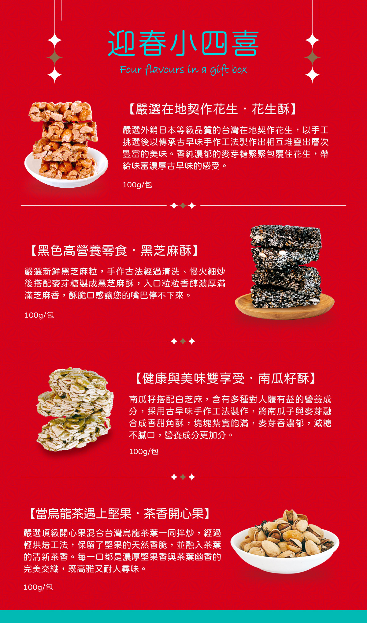 商品內容物:花生酥(100g/包)x1、芝麻酥(100g/包)x1、南瓜籽酥(100g/包)x1、茶香開心果(100g/包)x1