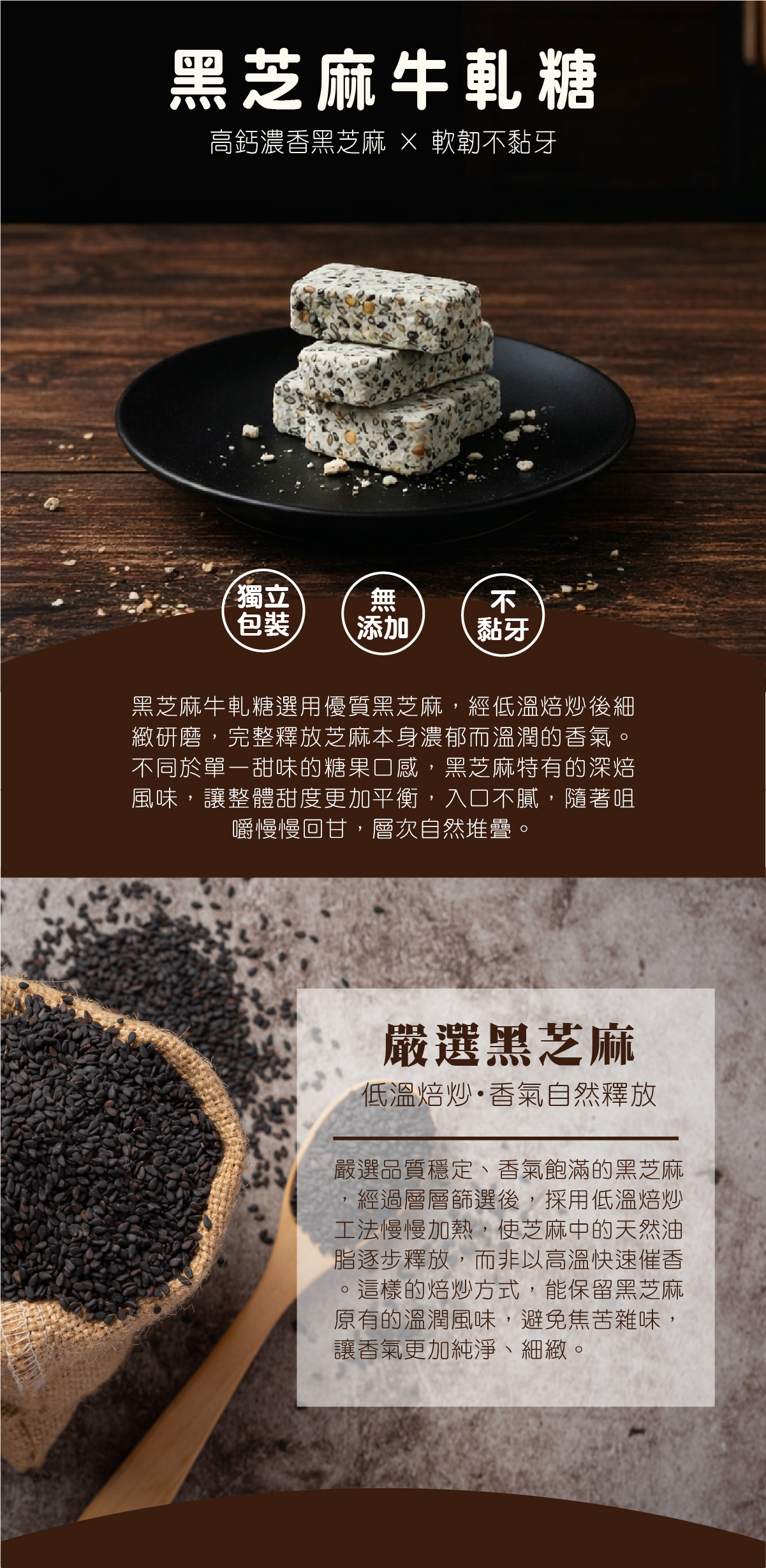 黑芝麻牛軋糖選用優質黑芝麻,經低溫焙炒後細緻研磨,完整釋放芝麻本身濃郁而溫潤的香氣。不同於單一甜味的糖果口感,黑芝麻特有的深焙風味,讓整體甜度更加平衡,入口不膩,隨著咀嚼慢慢回甘,層次自然堆疊。牛軋糖體特別調整比例,口感柔軟中帶有彈性,不易黏牙、不過硬,即使長時間咀嚼也依然舒適,讓不同年齡層都能安心享用。濃厚芝麻香與淡雅奶香彼此襯托,形成溫和卻耐吃的風味表現,是一款越吃越順口的經典口味。