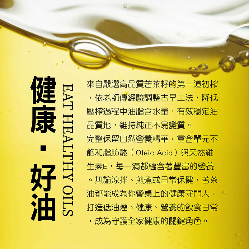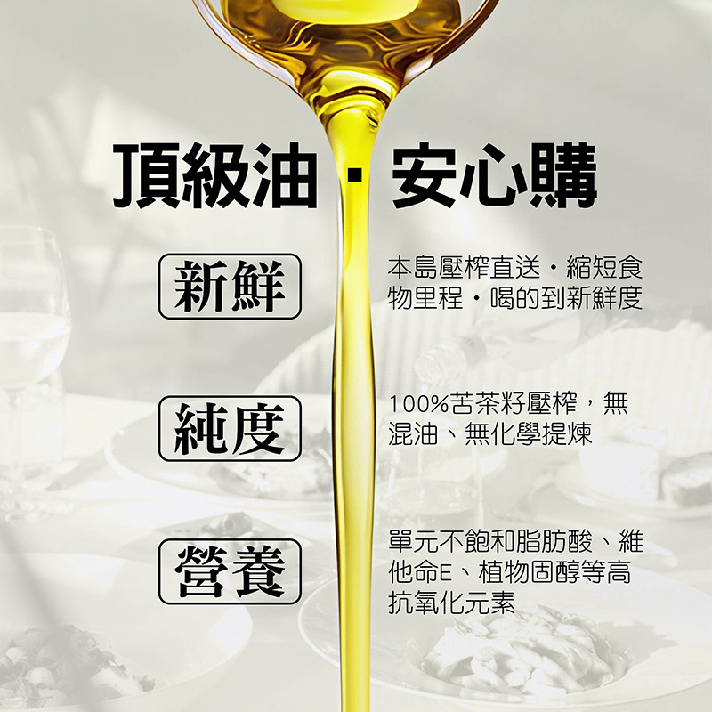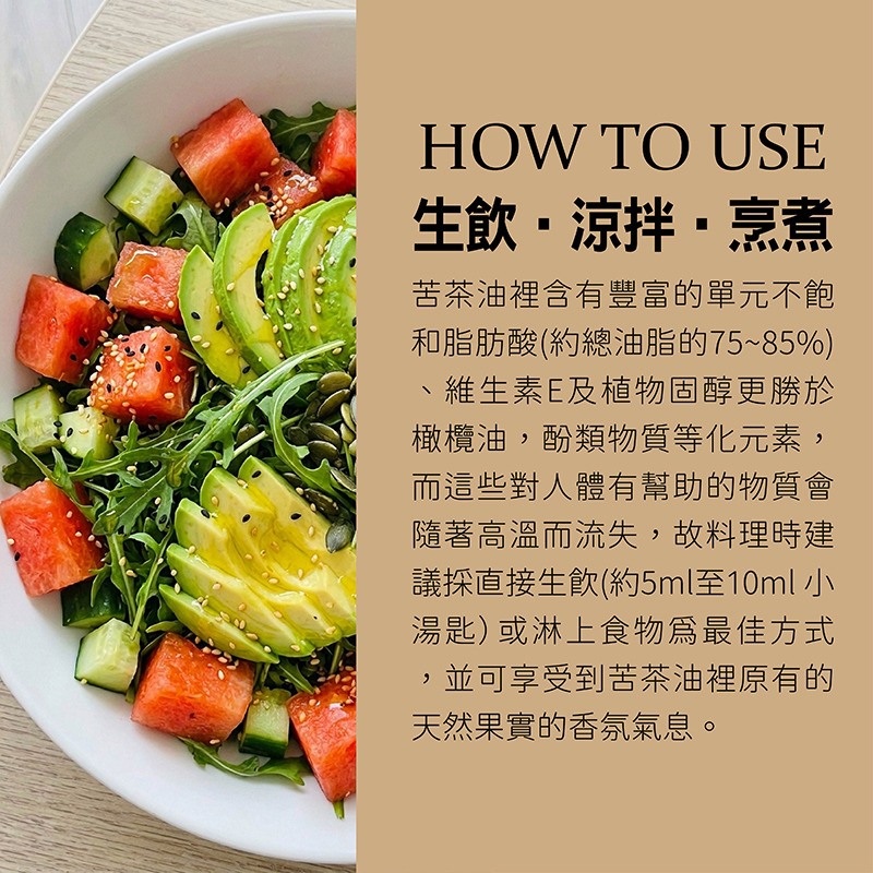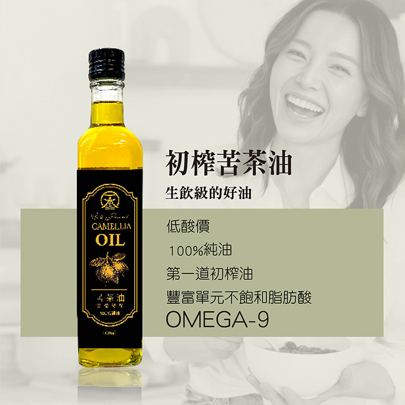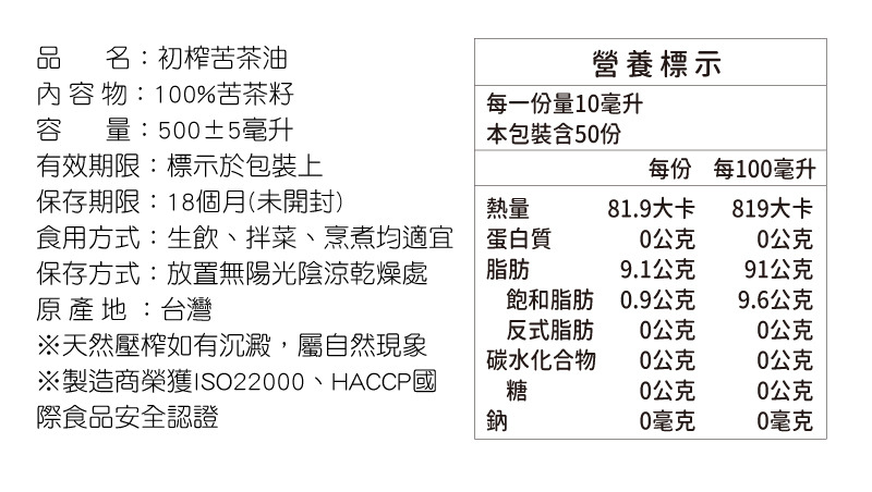 品 名:初榨苦茶油 內容物:100%苦茶籽 容 量:500±5毫升 有效期限:標示於包裝上 保存期限:18個月(未開封) 食用方式:生飲、拌菜、烹煮均適宜 保存方式:放置無陽光陰涼乾燥處 原產地:台灣 ※天然壓榨如有沉澱,屬自然現象 ※製造商榮獲ISO22000、HACCP國際食品安全認證