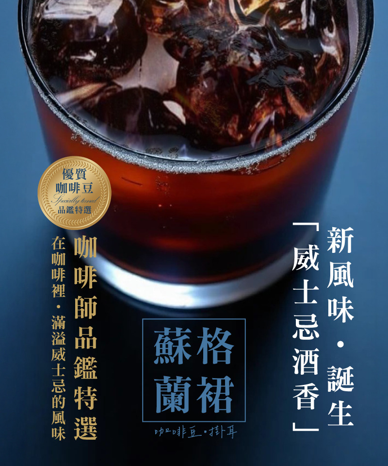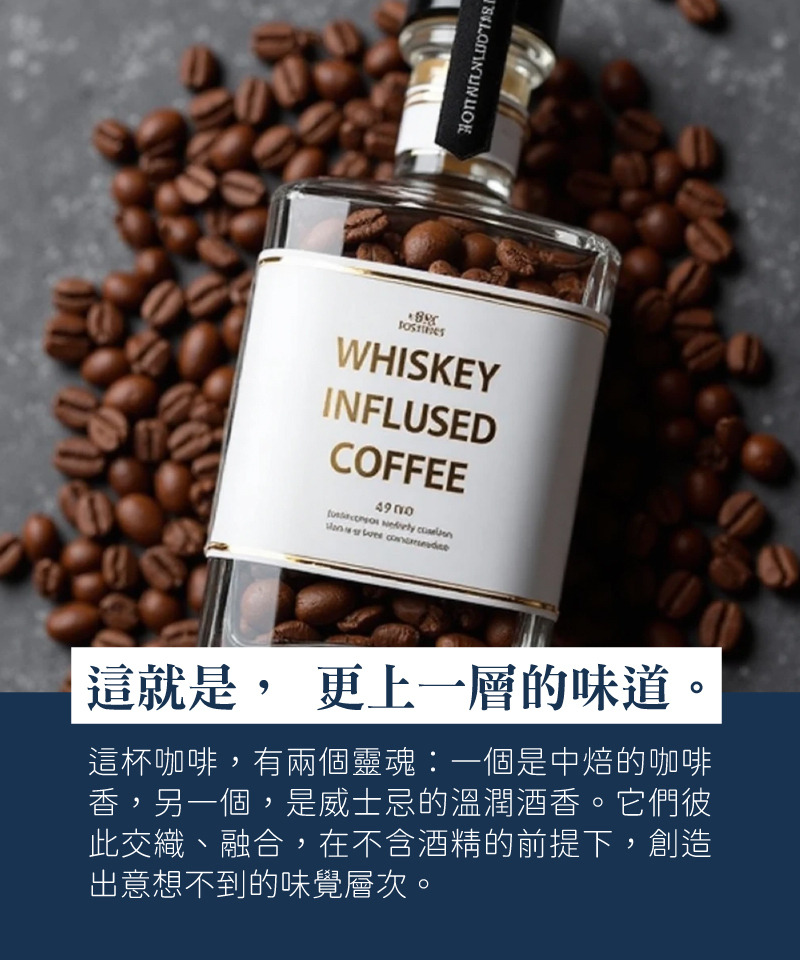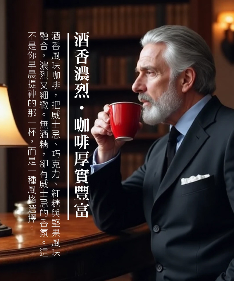 酒香風味咖啡,把威士忌、巧克力、紅糖與堅果風味融合,濃烈又細緻。無酒精,卻有威士忌的香氛。這不是你早晨提神的那一杯,而是一種風格選擇。